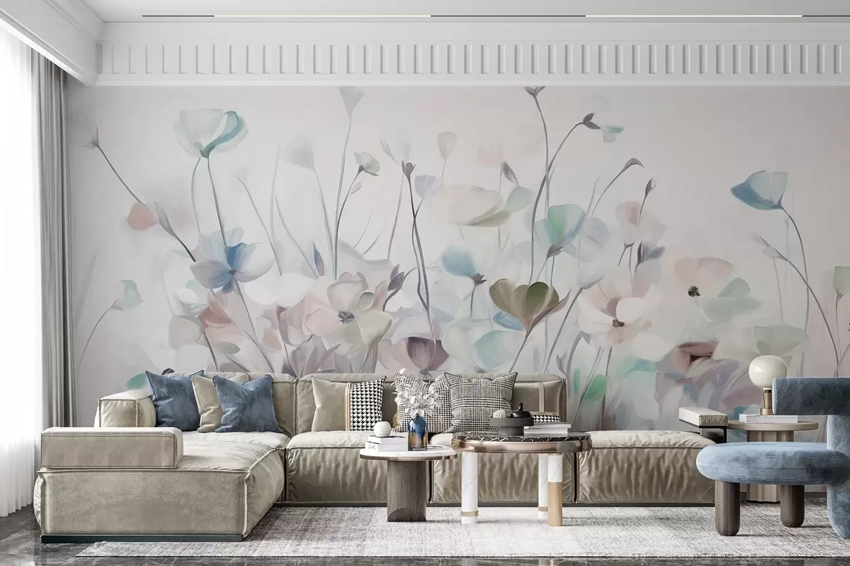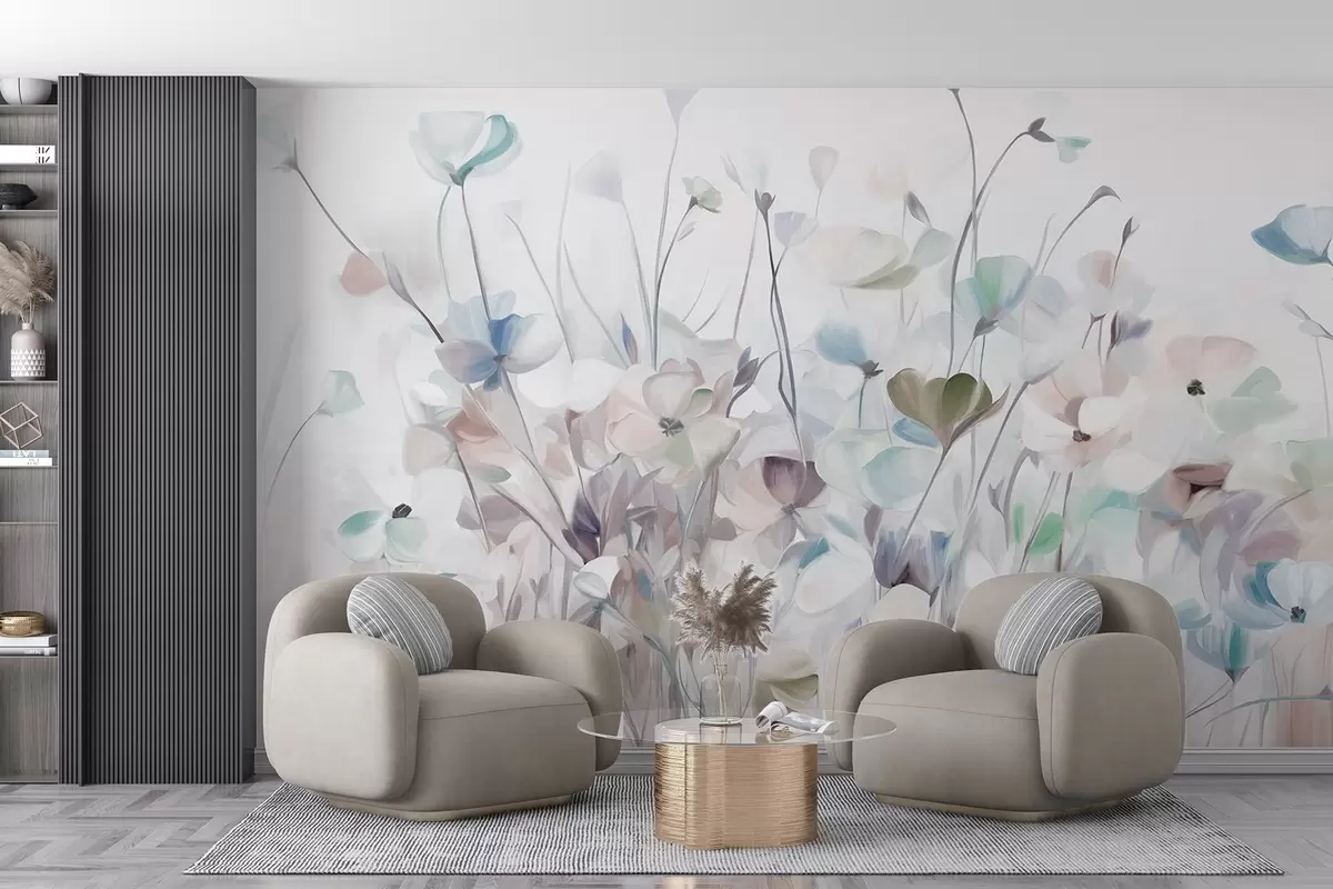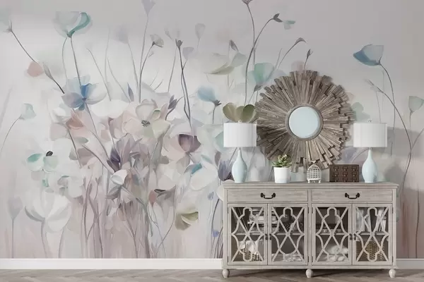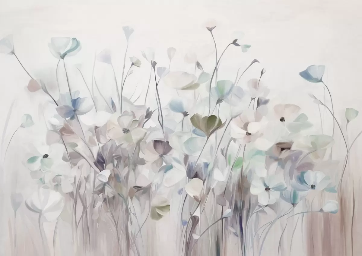 Valokuvatapetti Abstrakti kenttä sinisiä ja ruskeita kukkia, joilla on pitkät varret ja lehdet, teksturoitu, pastellivärit, hillityt värit Nr w09466v1