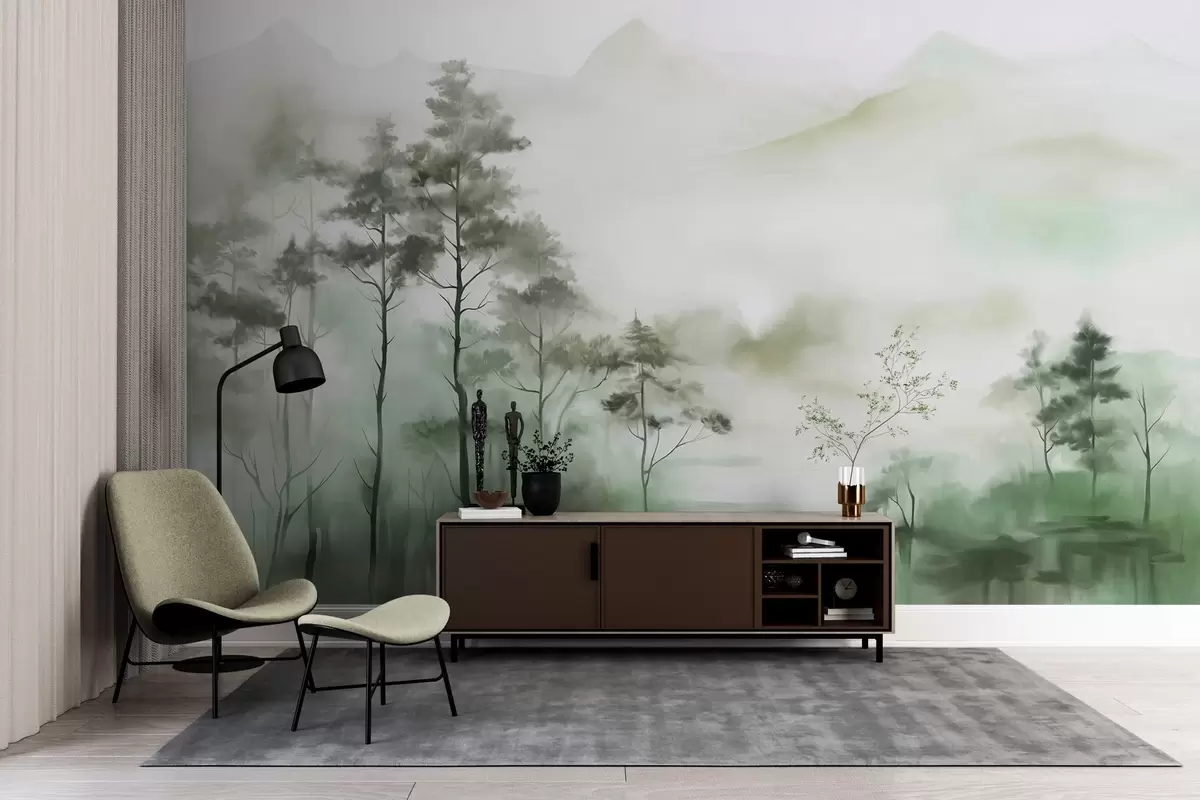 Valokuvatapetti Sumuiset maisemat, joissa on korkeita puita ja vuoria, hillityt vihreät ja harmaat sävyt, minimalistinen tyyli, tekstuurinen Nr w09469
