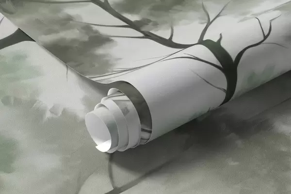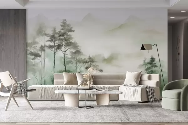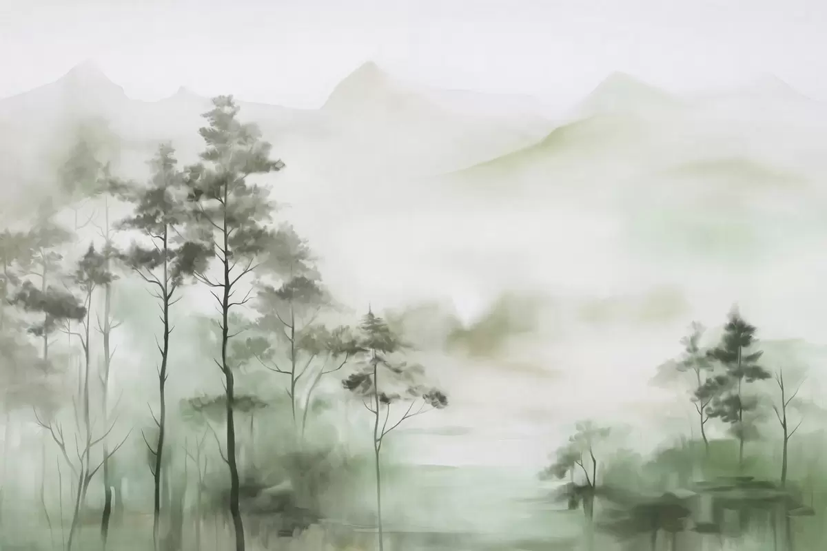 Valokuvatapetti Sumuiset maisemat, joissa on korkeita puita ja vuoria, hillityt vihreät ja harmaat sävyt, minimalistinen tyyli, tekstuurinen Nr w09469