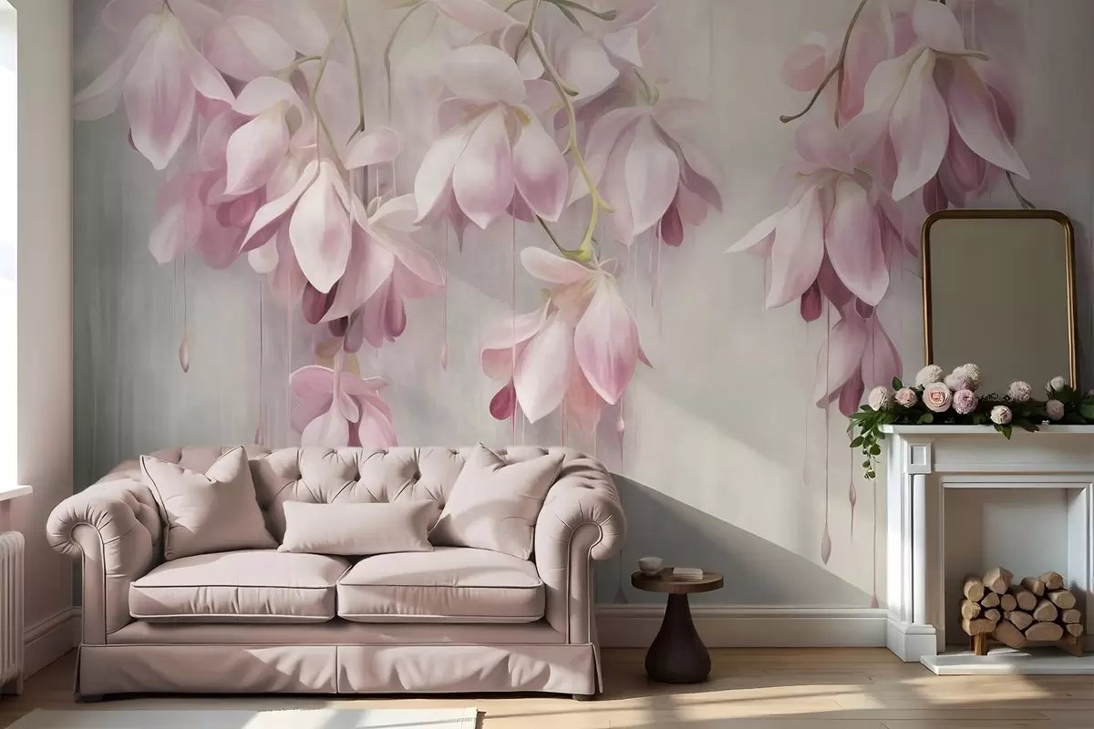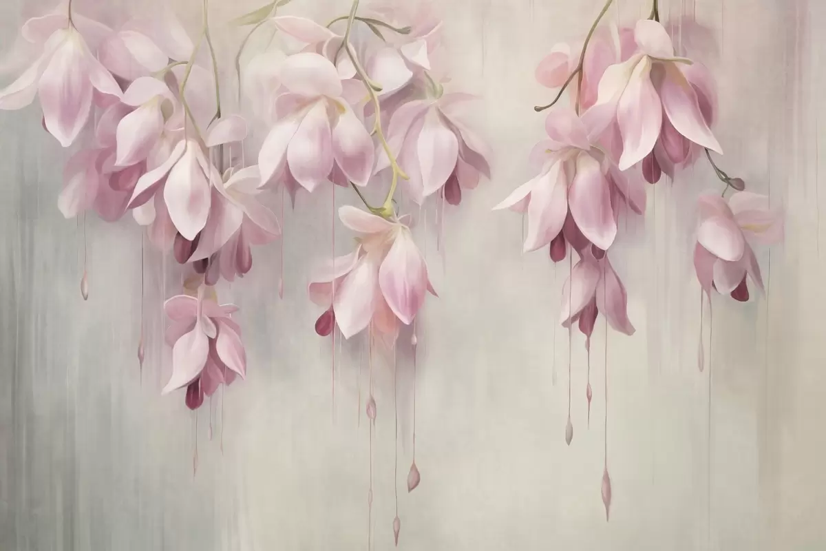 Valokuvatapetti Roikkuvat vaaleanpunaiset kukat, vaaleanharmaa tausta, kukkakuvioinen sommitelma, kasvitieteellinen taide, pastellivärit Nr w09471