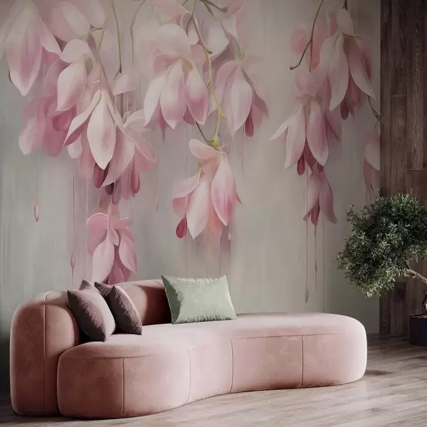 Valokuvatapetti Roikkuvat vaaleanpunaiset kukat, vaaleanharmaa tausta, kukkakuvioinen sommitelma, kasvitieteellinen taide, pastellivärit Nr w09471