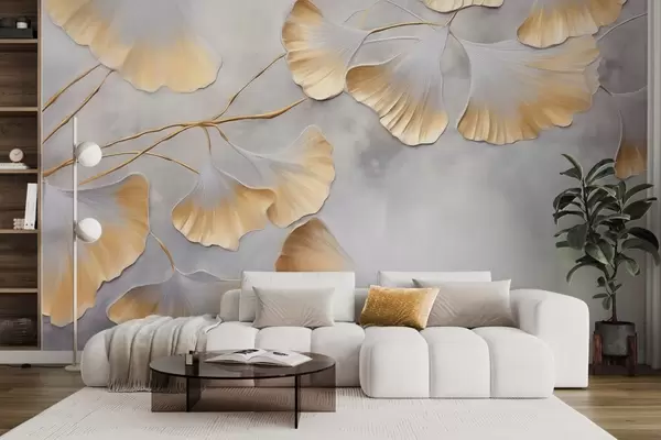 Valokuvatapetti Ginkgo biloba -lehdet, joiden reunat ovat keltaiset, oksalla, harmaa teksturoitu tausta, tyylikäs ja minimalistinen muotoilu Nr w09472