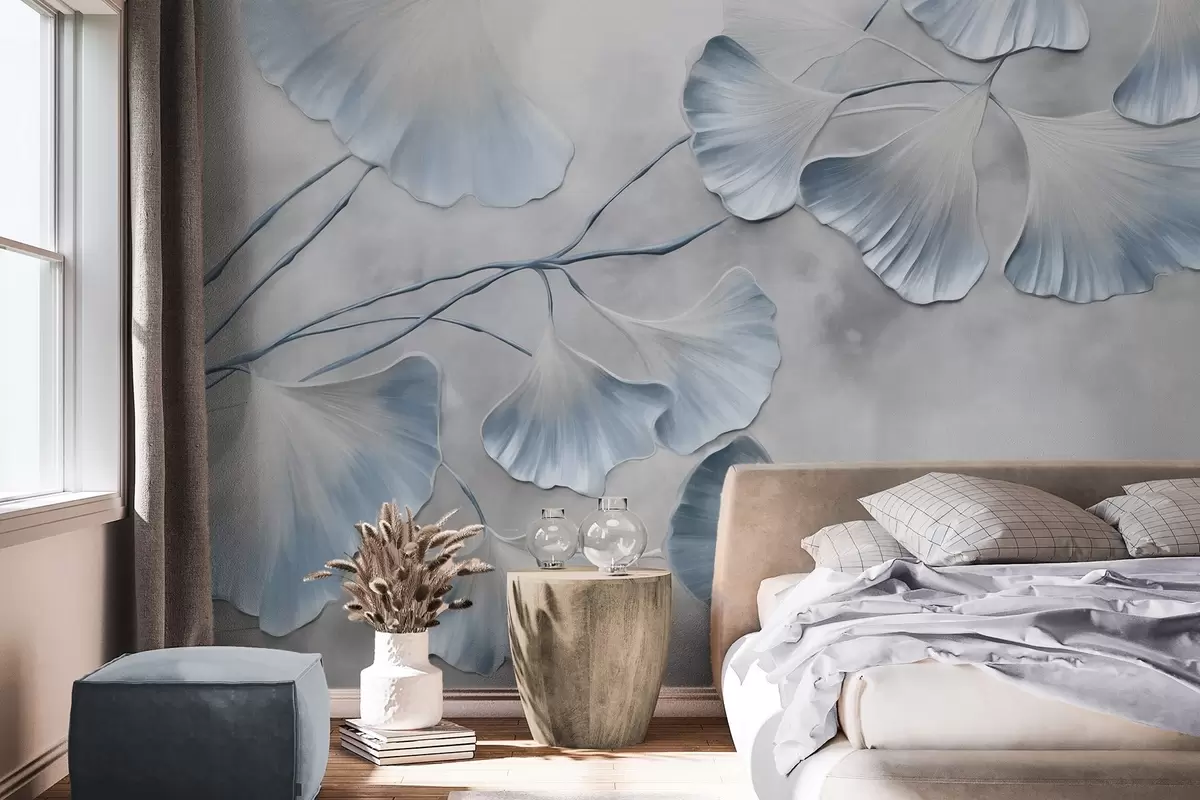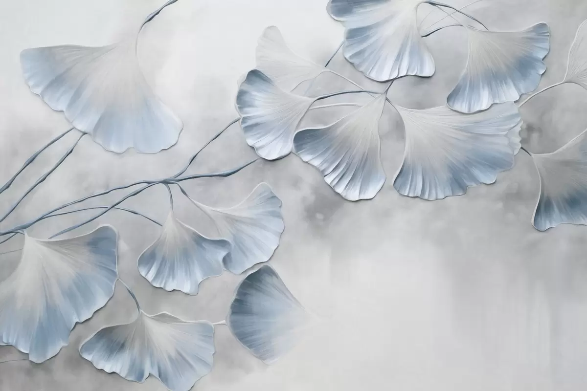 Valokuvatapetti Ginkgo biloba -lehdet sinisillä reunoilla oksalla, harmaa teksturoitu tausta, tyylikäs ja minimalistinen muotoilu Nr w09472v1