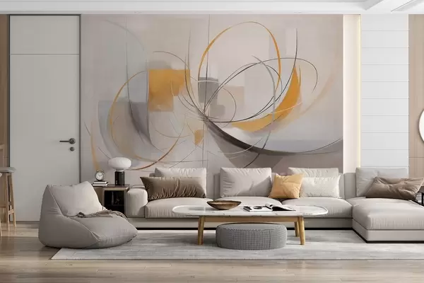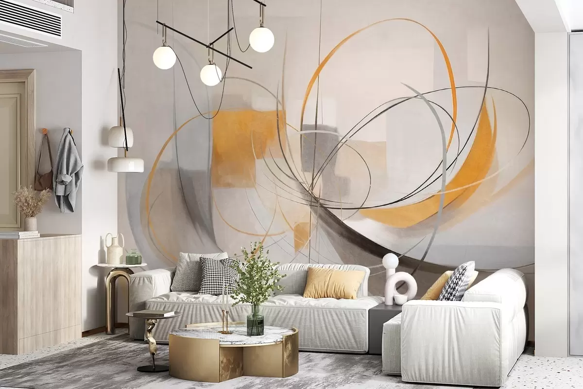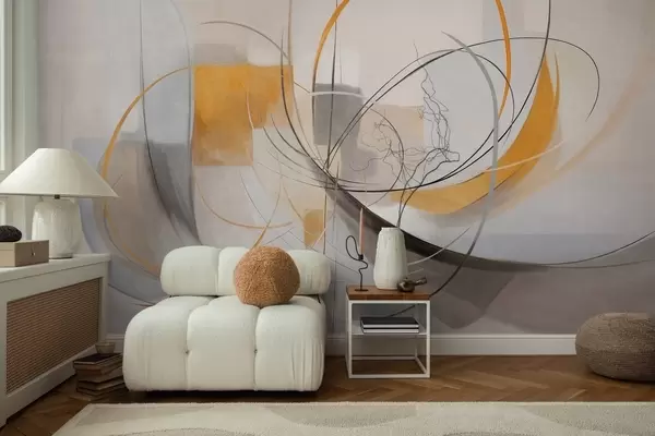 Valokuvatapetti Abstrakti, teksturoitu moderni maalaus tyylillä, jossa on kaarevia viivoja ja geometrisia muotoja harmaan, valkoisen ja oranssin sävyissä Nr w09476