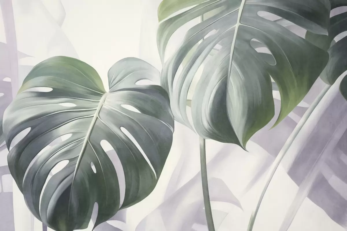 Valokuvatapetti Teksturoidut monsteran lehdet, suuret ja vihreät, pehmeää, vaaleaa abstraktia taustaa vasten Nr w09477