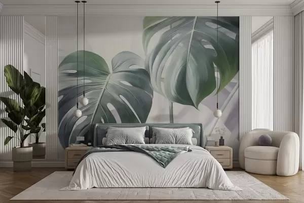 Valokuvatapetti Teksturoidut monsteran lehdet, suuret ja vihreät, pehmeää, vaaleaa abstraktia taustaa vasten Nr w09477