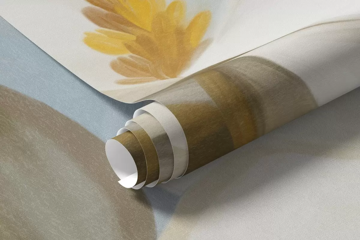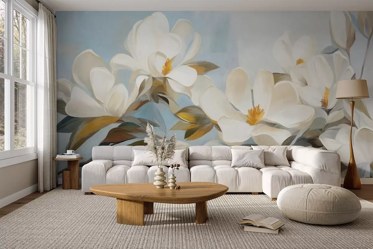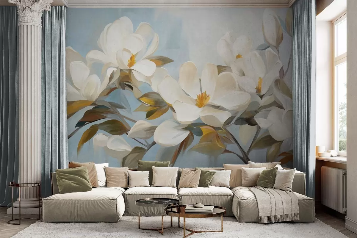 Valokuvatapetti Valkoiset magnoliat ja vihreät lehdet vaaleansinisellä taustalla, abstraktilla siveltimenvetoilla jäljiteltyinä. Nr w09478