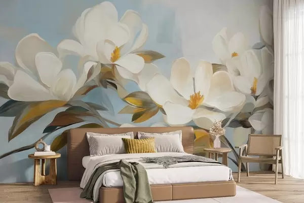 Valokuvatapetti Valkoiset magnoliat ja vihreät lehdet vaaleansinisellä taustalla, abstraktilla siveltimenvetoilla jäljiteltyinä. Nr w09478