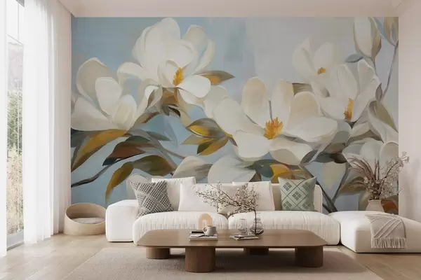 Valokuvatapetti Valkoiset magnoliat ja vihreät lehdet vaaleansinisellä taustalla, abstraktilla siveltimenvetoilla jäljiteltyinä. Nr w09478