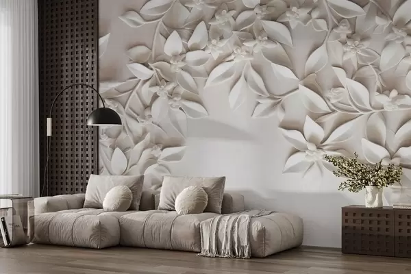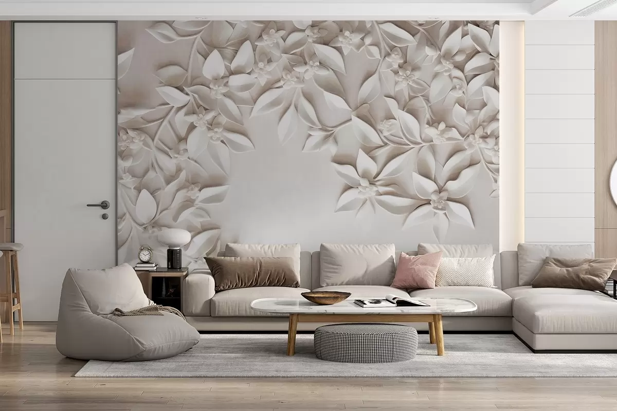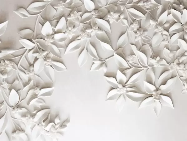 Valokuvatapetti Valkoiset teksturoidut kukat ja lehdet, kukka-asetelma, tyylikäs muotoilu, minimalistinen tyyli, koristeellinen taide Nr w09479