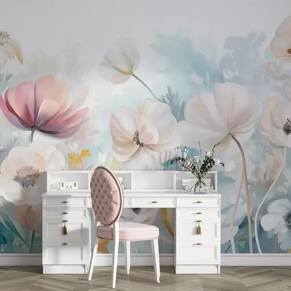 Valokuvatapetti Pastelliväristen kukkien kenttä, jossa on herkät terälehdet ja pehmeät vihreät lehdet, unenomaisessa, teksturoidussa akvarellityylissä Nr w09481