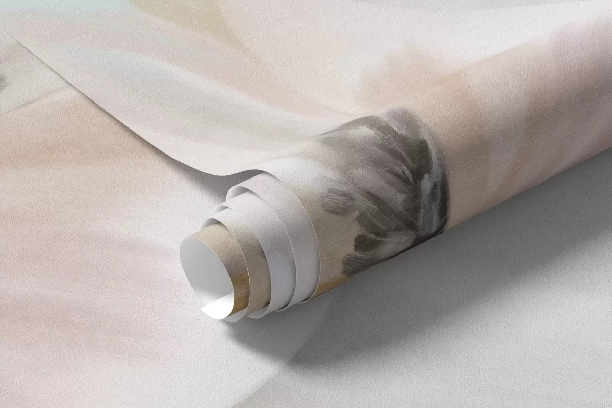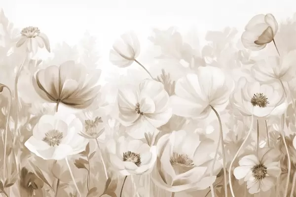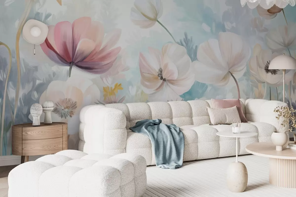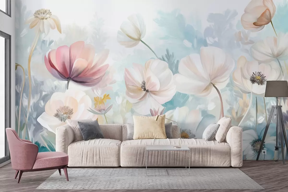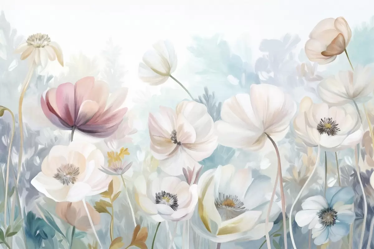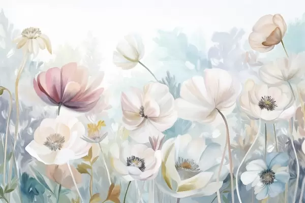Valokuvatapetti Pastelliväristen kukkien kenttä, jossa on herkät terälehdet ja pehmeät vihreät lehdet, unenomaisessa, teksturoidussa akvarellityylissä Nr w09481