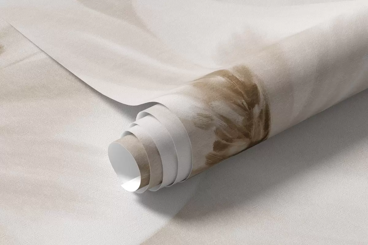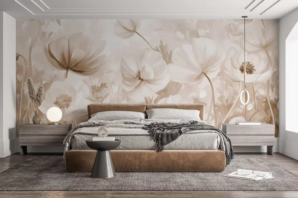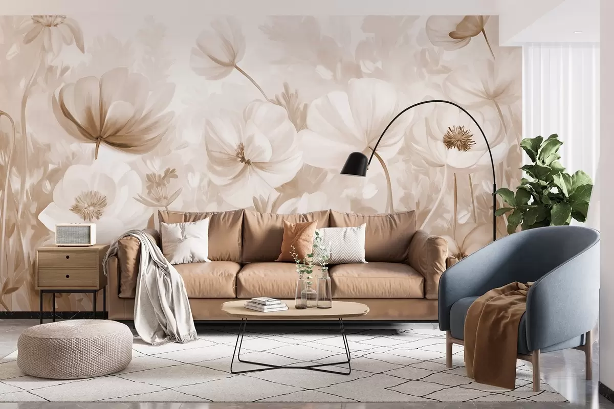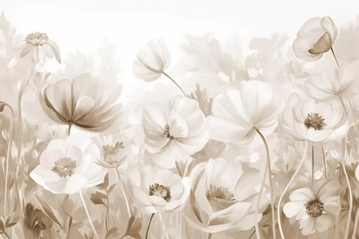 Valokuvatapetti Beigenväristen kukkien kenttä, jossa on herkät terälehdet ja pehmeät ruskeat lehdet, unenomaisessa, teksturoidussa vesivärityylissä Nr w09481v1