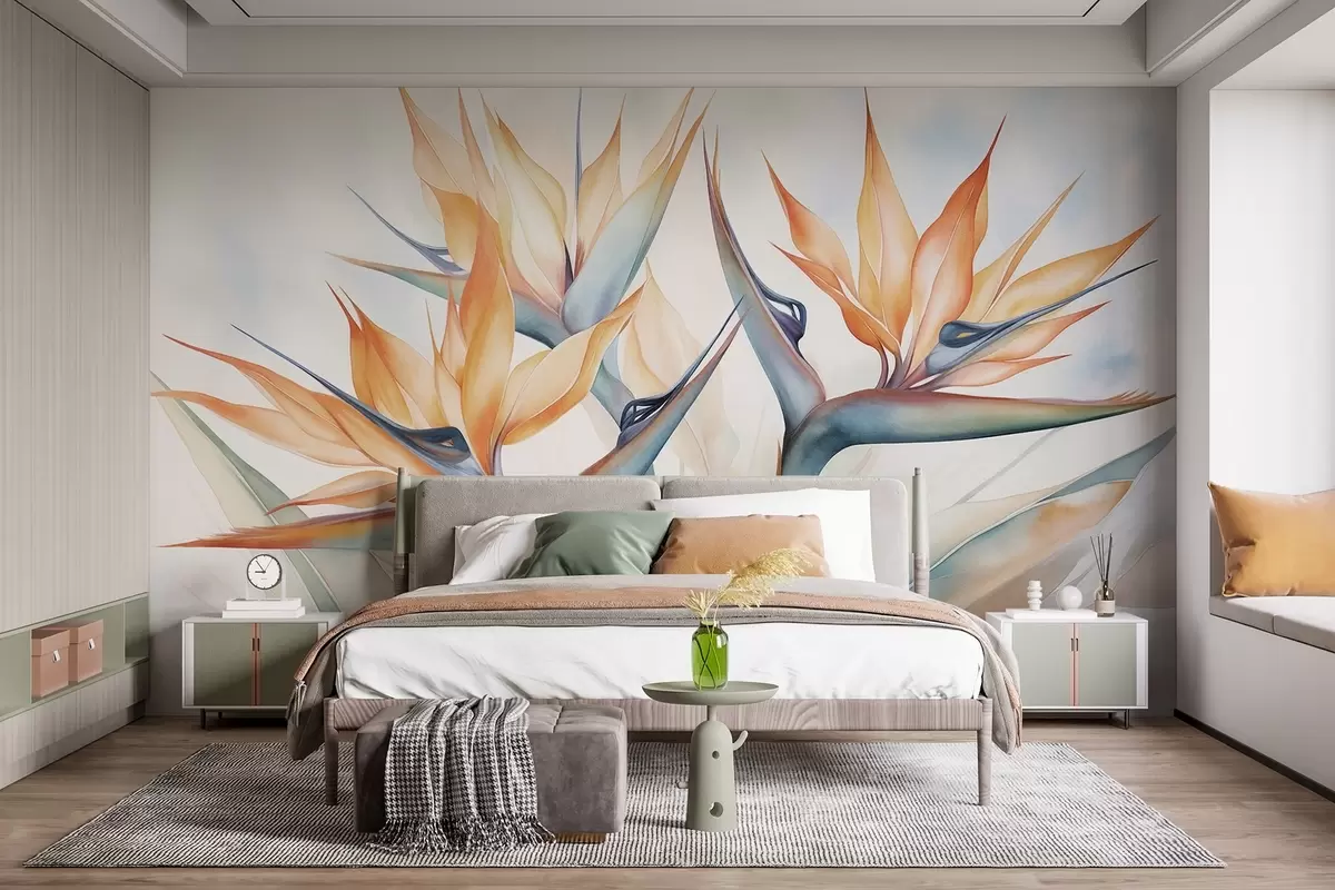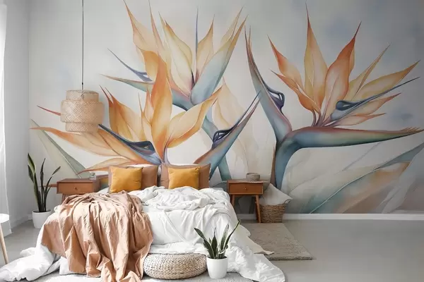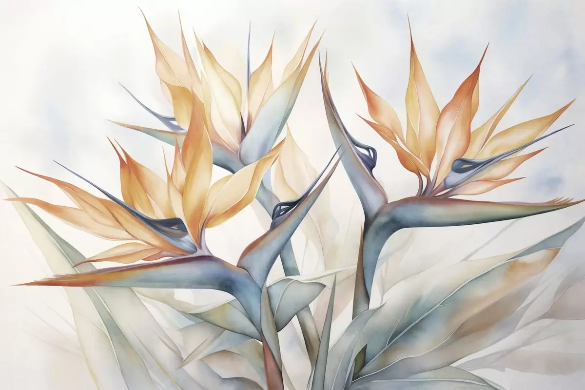 Valokuvatapetti Paratiisilintu-kukka, strelitzia oransseilla terälehdillä, pehmeä akvarellitekstuurinen tyyli, vaalea tausta Nr w09483