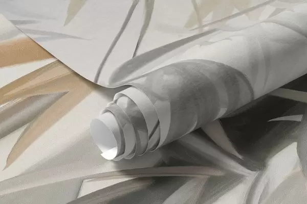 Valokuvatapetti Teksturoidut bambunvarret ja lehdet pehmeässä, hillityssä harmaan, valkoisen ja kerman värimaailmassa, minimalistinen sommitelma Nr w09485