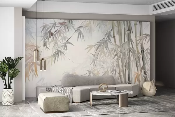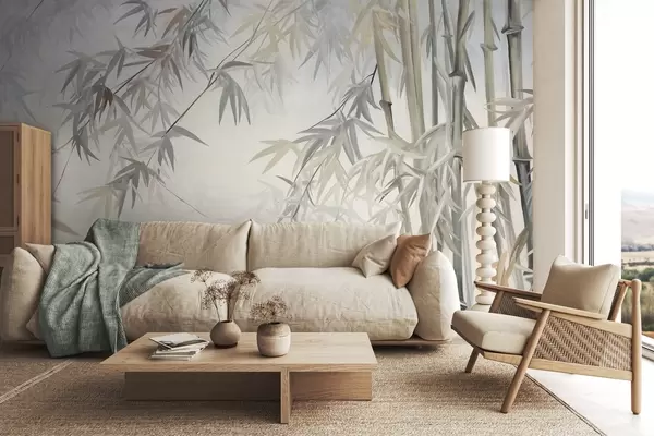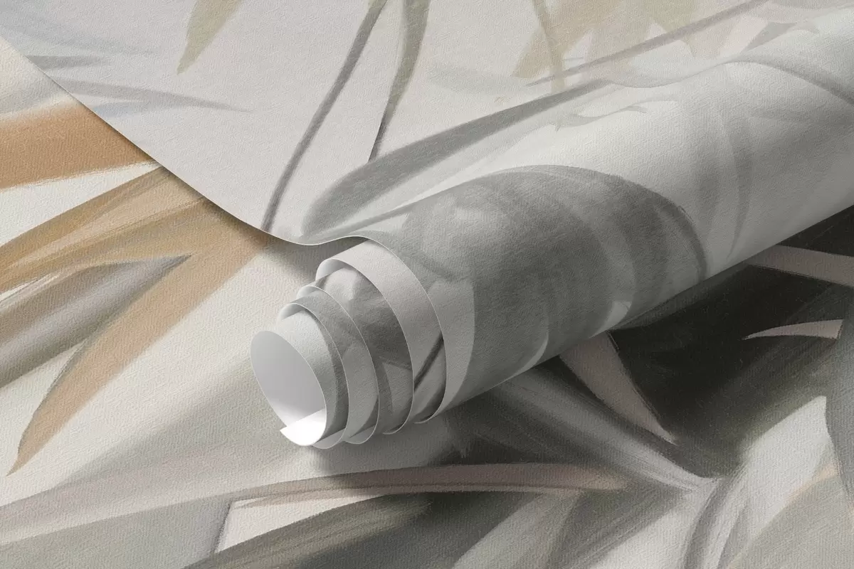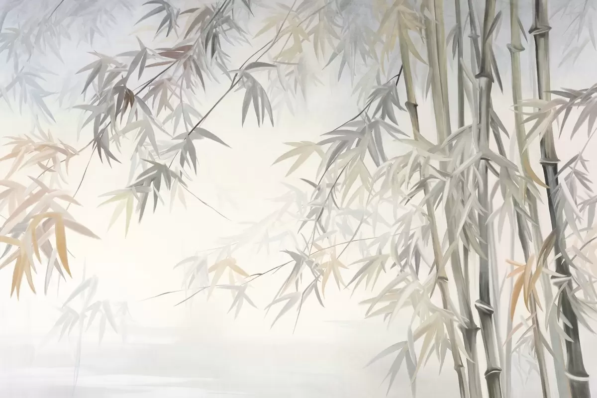 Valokuvatapetti Teksturoidut bambunvarret ja lehdet pehmeässä, hillityssä harmaan, valkoisen ja kerman värimaailmassa, minimalistinen sommitelma Nr w09485