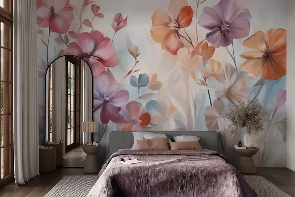Valokuvatapetti Tekstuurinen kukka-asetelma, jossa on vaaleanpunaisia, violetteja ja oransseja kukkia sekä vihreitä varret ja lehdet, pehmeät pastellivärit Nr w09486