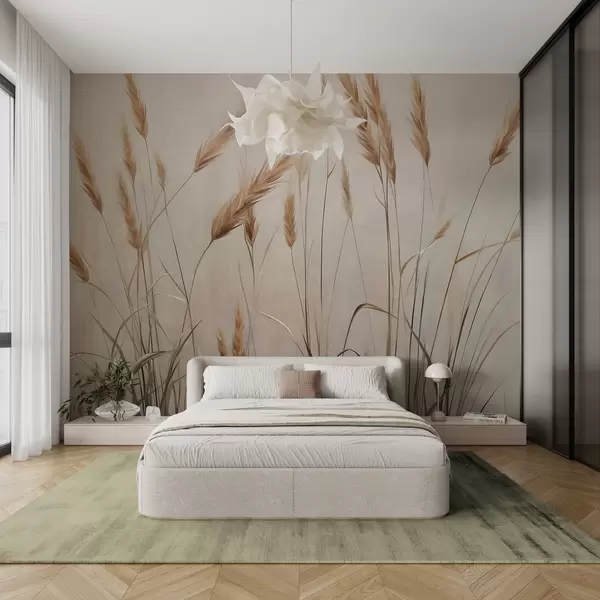 Valokuvatapetti Vehnän teksturoitu pelto, jossa on keltaisia jyviä, beige tausta, luonnollinen valaistus, lämpimät sävyt, yksityiskohtaiset siveltimenvedot Nr w09493