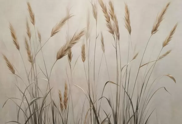 Valokuvatapetti Vehnän teksturoitu pelto, jossa on keltaisia jyviä, beige tausta, luonnollinen valaistus, lämpimät sävyt, yksityiskohtaiset siveltimenvedot Nr w09493