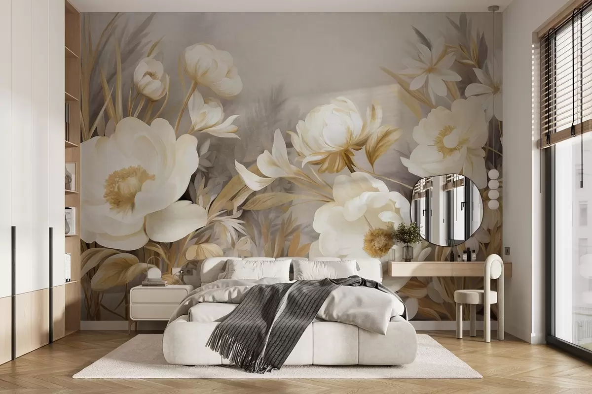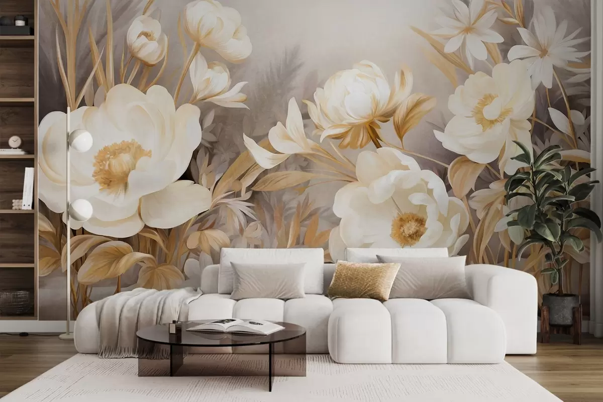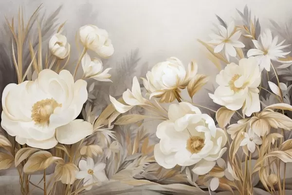 Valokuvatapetti Valkoiset ja keltaiset pionit ja muut kukat, korkea ruoho ja lehdet pehmeässä, maalauksellisessa tekstuurissa. Nr w09494