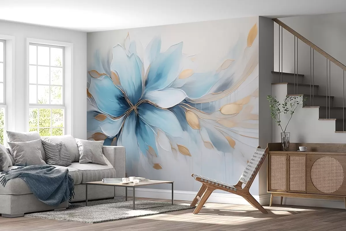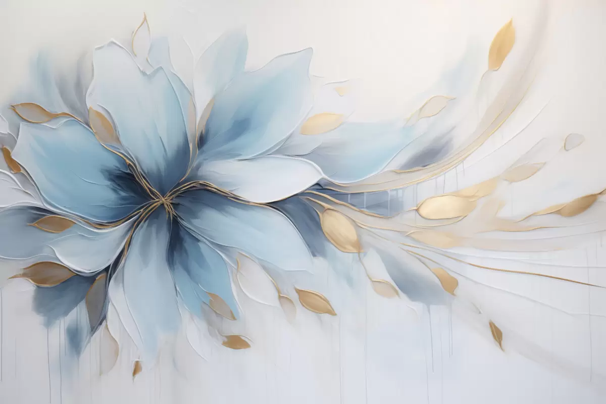 Valokuvatapetti Abstrakti sininen kukka, joka symboloi rauhaa, lehtineen Nr w09500