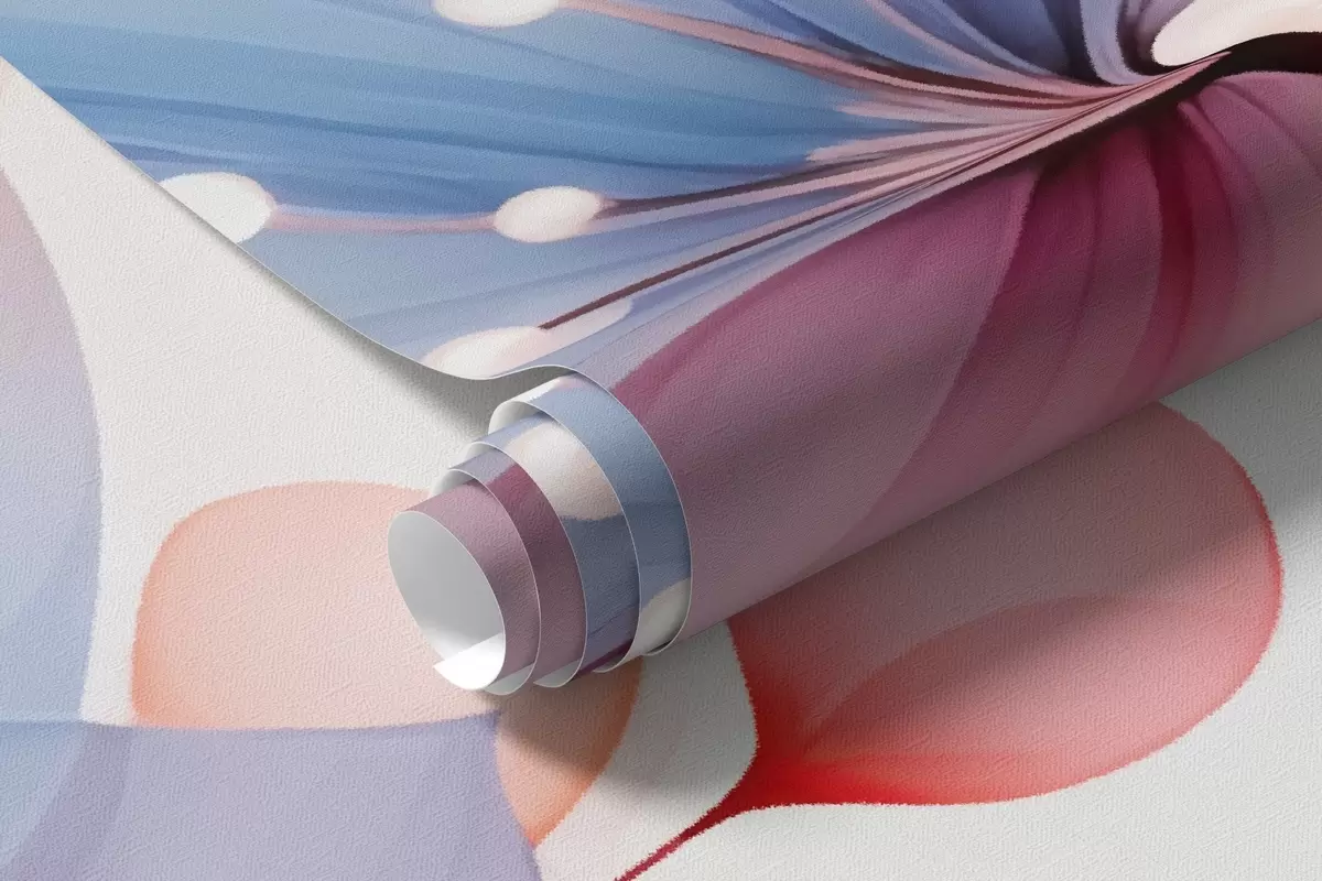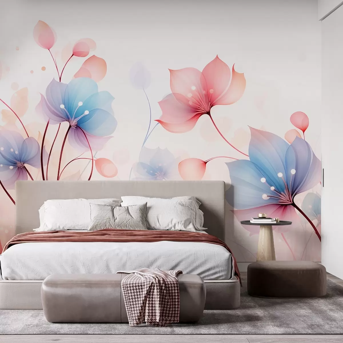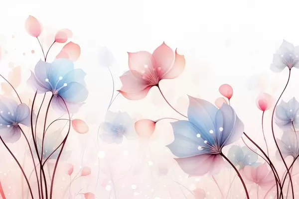 Valokuvatapetti Hienostuneet vaaleanpunaiset ja siniset kukat — ilmava kukkakuvio valkoisella vesiväri-taustalla Nr w09507