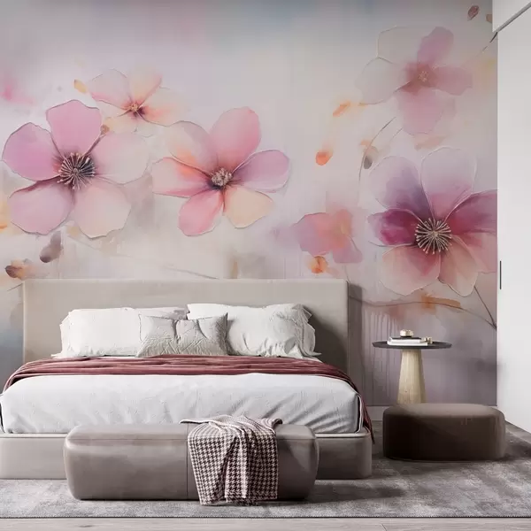 Valokuvatapetti Vesiväri-tyylinen oksa, jossa on vaaleanpunaisia kukkia Nr w09522