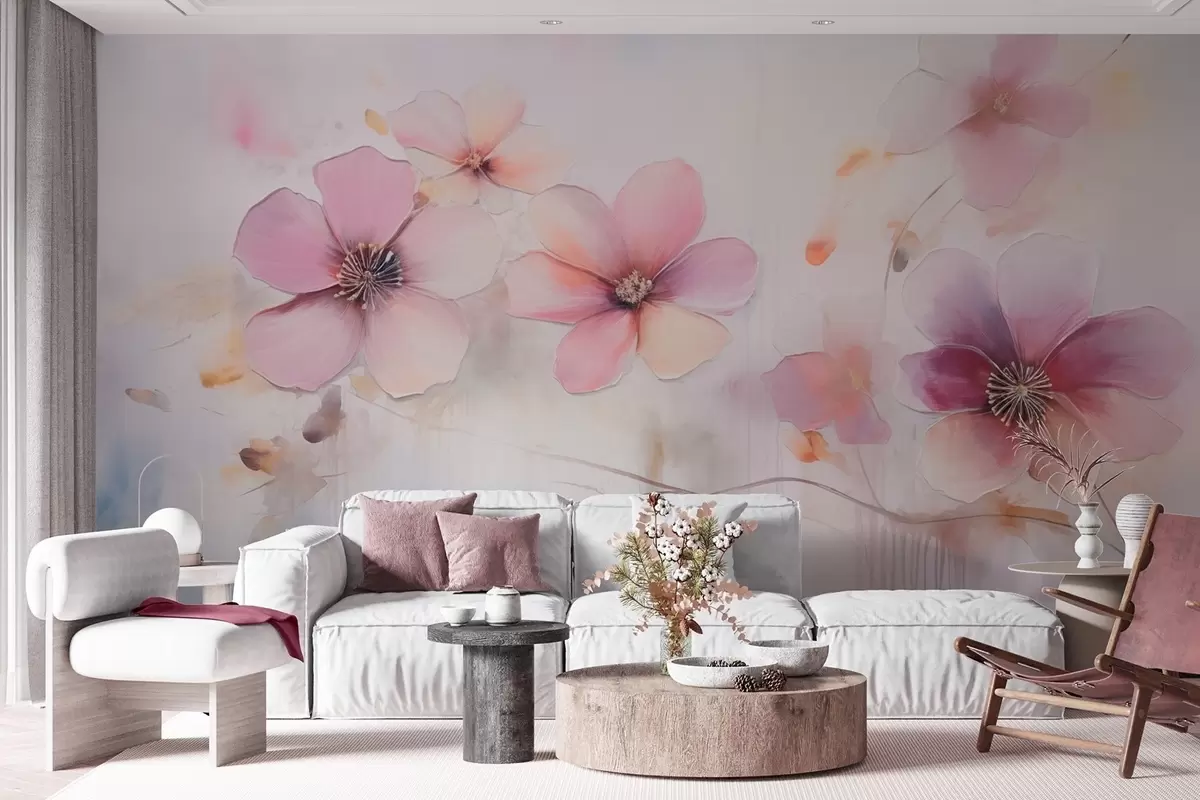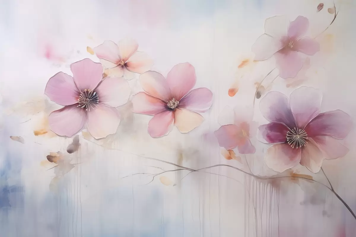 Valokuvatapetti Vesiväri-tyylinen oksa, jossa on vaaleanpunaisia kukkia Nr w09522