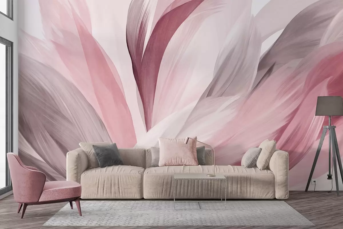 Valokuvatapetti Abstraktit teksturoidut höyhenet vaaleanpunaisina, valkoisina ja harmaana sekä eri sävyinä, päällekkäin valkoisella taustalla Nr w09531v2