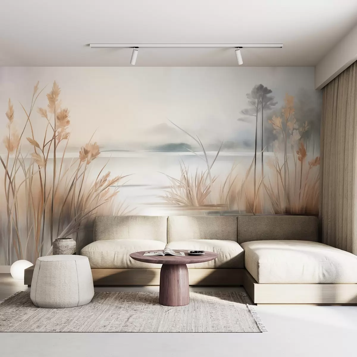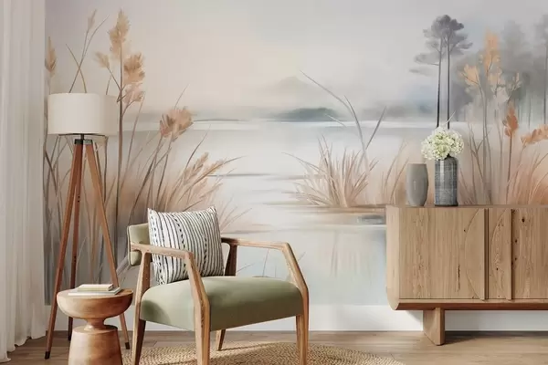 Valokuvatapetti Maisema, jossa etualalla on järvi ja korkea ruoho, taustalla vuoret, pehmeät värit, teksturoitu Nr w09534