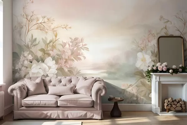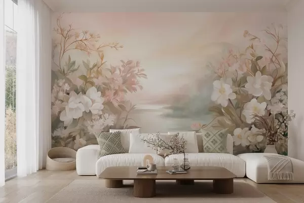 Valokuvatapetti Maisema, jossa on kukkien ja kasvien ympäröimä joki, pehmeät värit, vaaleanpunainen taivas, akvarellitekstuurinen tyyli Nr w09537