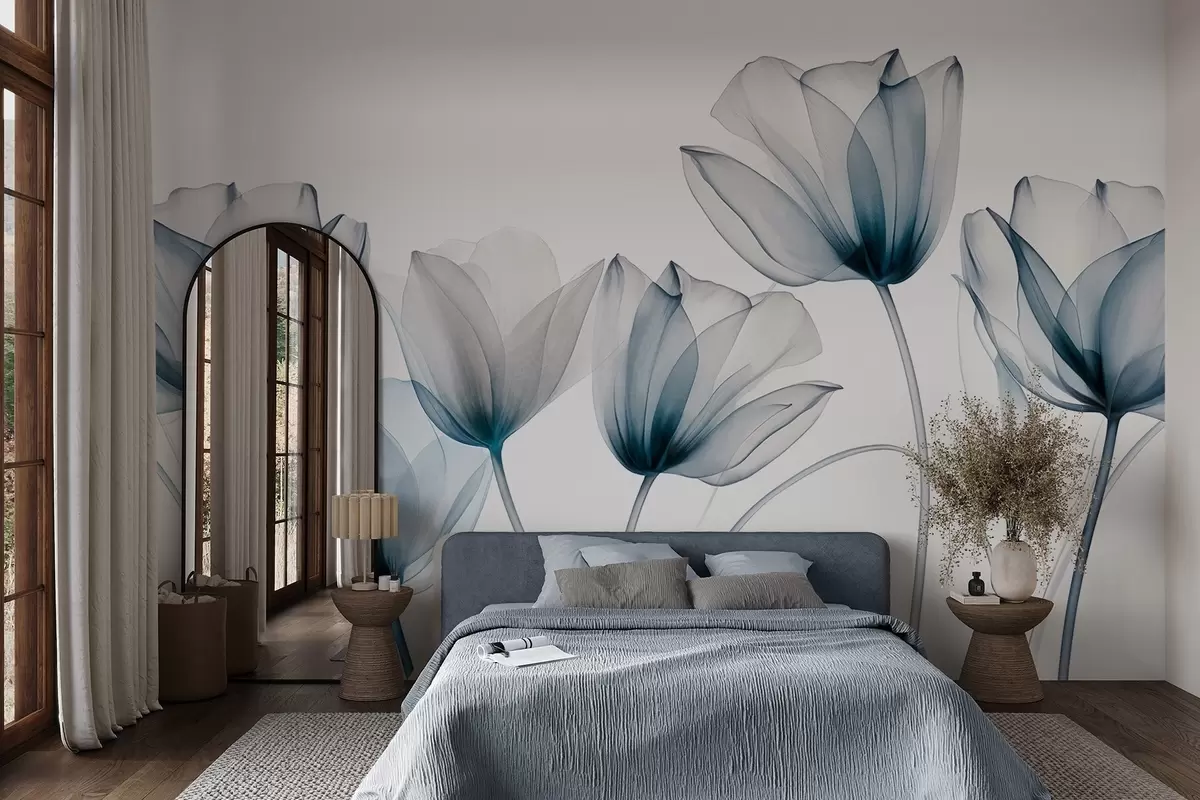 Valokuvatapetti Läpikuultavat siniset ja valkoiset tulppaanikukat pitkillä varrilla, vaaleaa taustaa vasten, herkkä ja tekstuurinen kukkataide Nr w09538