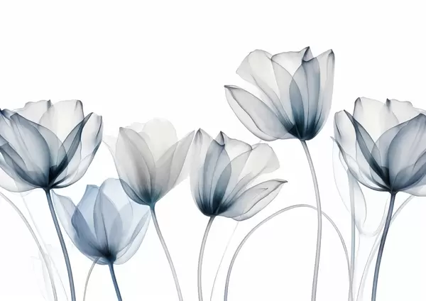 Valokuvatapetti Läpikuultavat siniset ja valkoiset tulppaanikukat pitkillä varrilla, vaaleaa taustaa vasten, herkkä ja tekstuurinen kukkataide Nr w09538