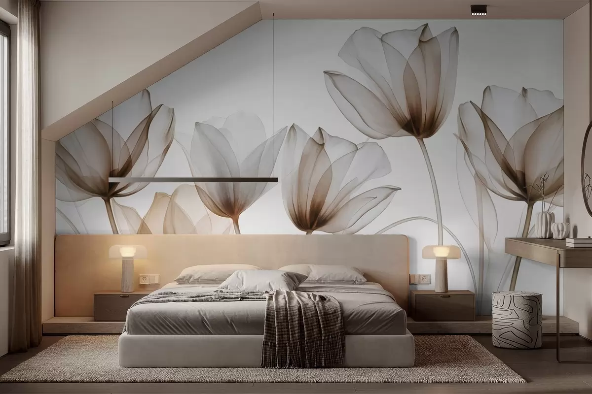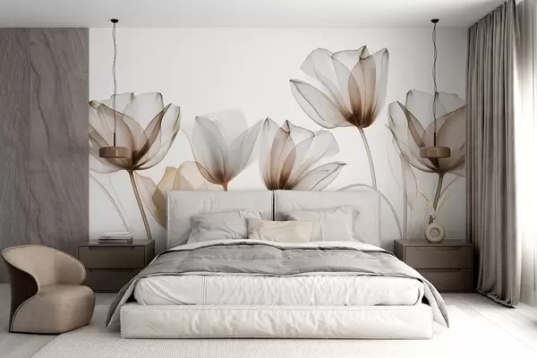 Valokuvatapetti Läpikuultavat ruskeat ja valkoiset tulppaanikukat pitkillä varrilla, vaaleaa taustaa vasten, herkkä ja tekstuurinen kukkataide Nr w09538v1