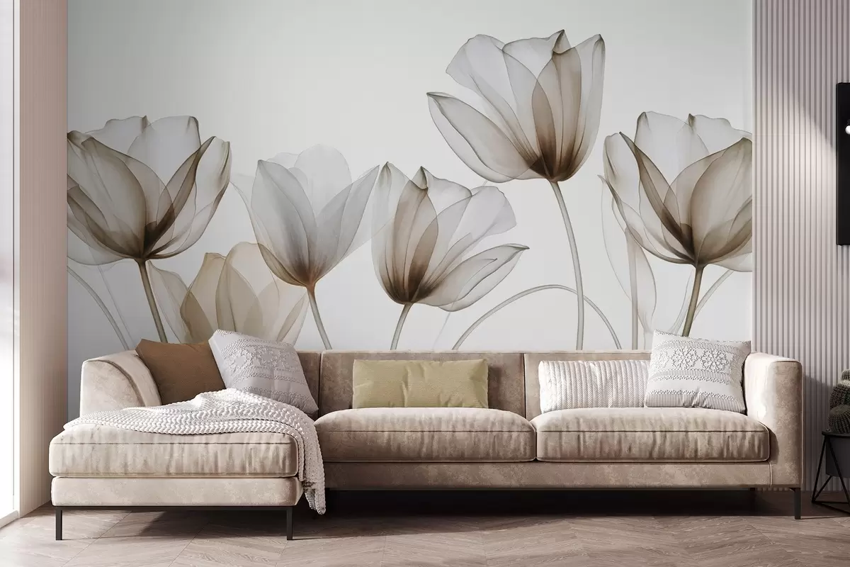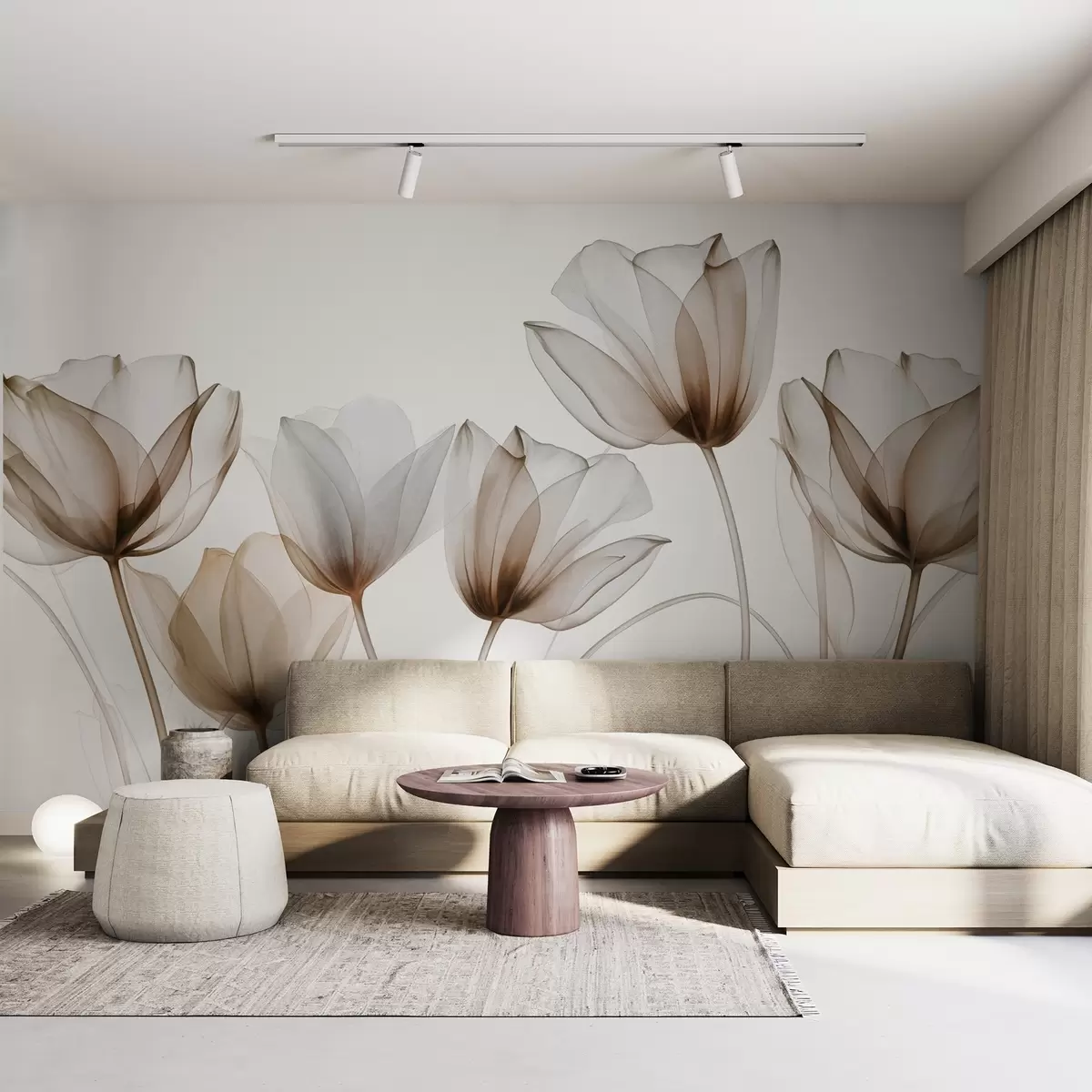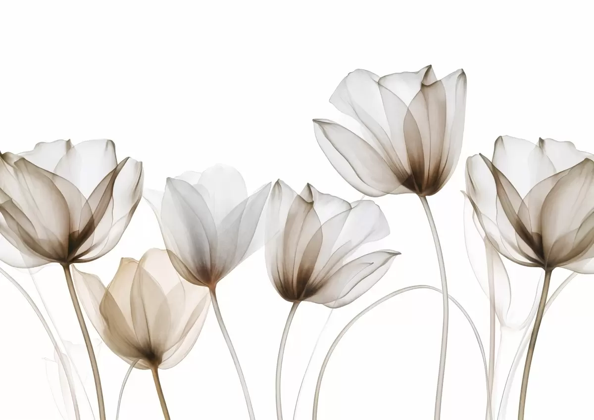 Valokuvatapetti Läpikuultavat ruskeat ja valkoiset tulppaanikukat pitkillä varrilla, vaaleaa taustaa vasten, herkkä ja tekstuurinen kukkataide Nr w09538v1