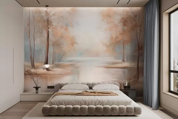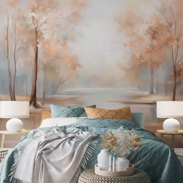 Valokuvatapetti Syksyinen teksturoitu maisema puineen ja joineen, pehmeät värit, kevyt ja ilmava tunnelma, rauhallinen ja hiljainen näkymä Nr w09541