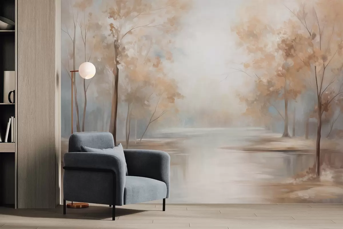 Valokuvatapetti Syksyinen teksturoitu maisema puineen ja joineen, pehmeät värit, kevyt ja ilmava tunnelma, rauhallinen ja hiljainen näkymä Nr w09541