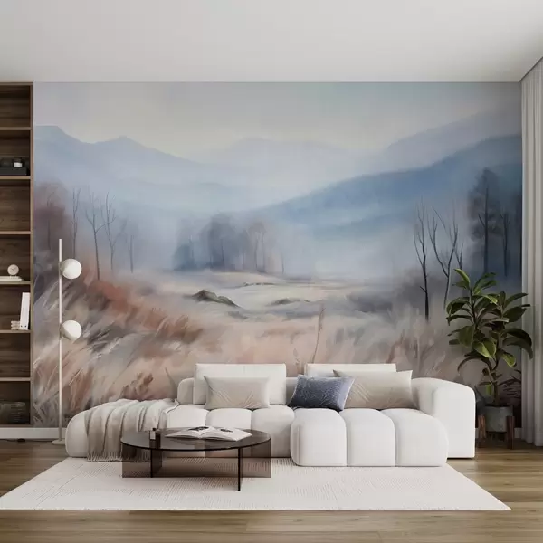 Valokuvatapetti Teksturoitu maisema, jossa etualalla on kuivaa ruohoa ja taustalla puita, sekä kaukana vuoria. Nr w09542