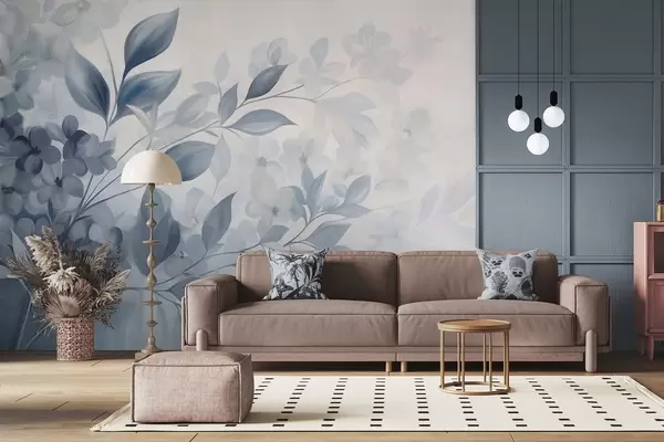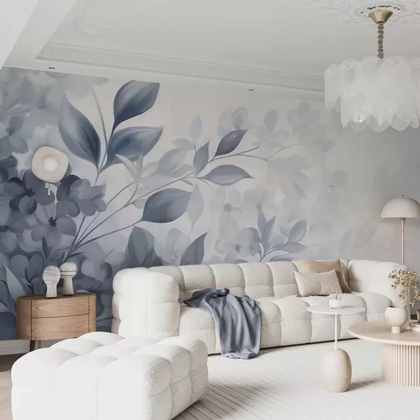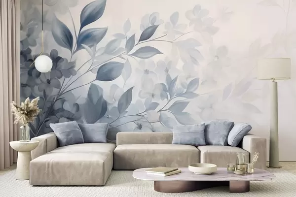 Valokuvatapetti Teksturoitu sinivalkoinen oksa, jossa kukat ja lehdet haalistuvat vaaleaan taustaan vesivärimaalaustekniikalla. Nr w09543
