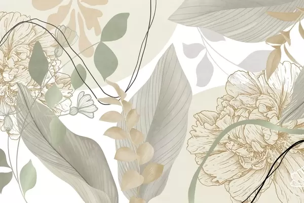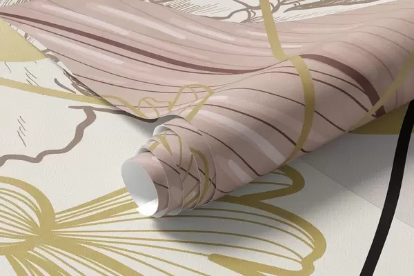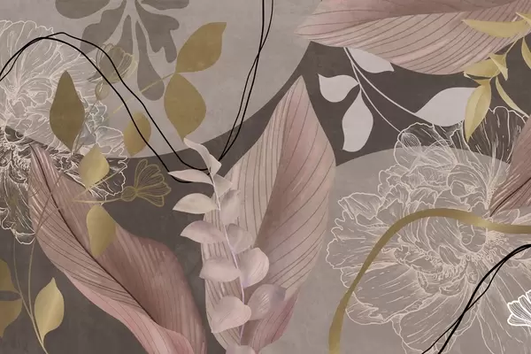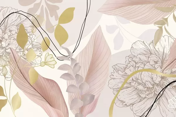 Valokuvatapetti Abstrakti kukkakuvio, jossa on suuria lehtiä hillityn vaaleanpunaisissa ja keltaisissa sävyissä, ohuilla mustilla viivoilla ja valkoisilla kukkien ääriviivoilla. Nr w09544v1