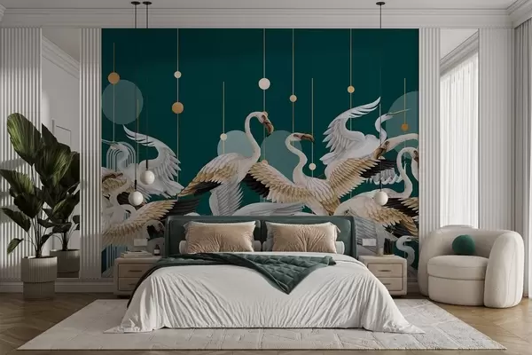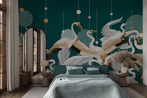 Valokuvatapetti Parvi valkoisia flamingoja, joilla on herkät siivet, tumman sinivihreää taustaa vasten, jossa on keltaisia viivoja ja ympyröitä. Nr w09546