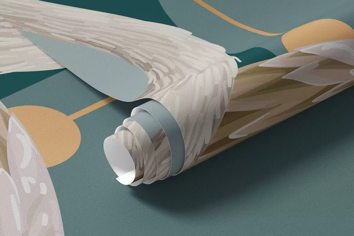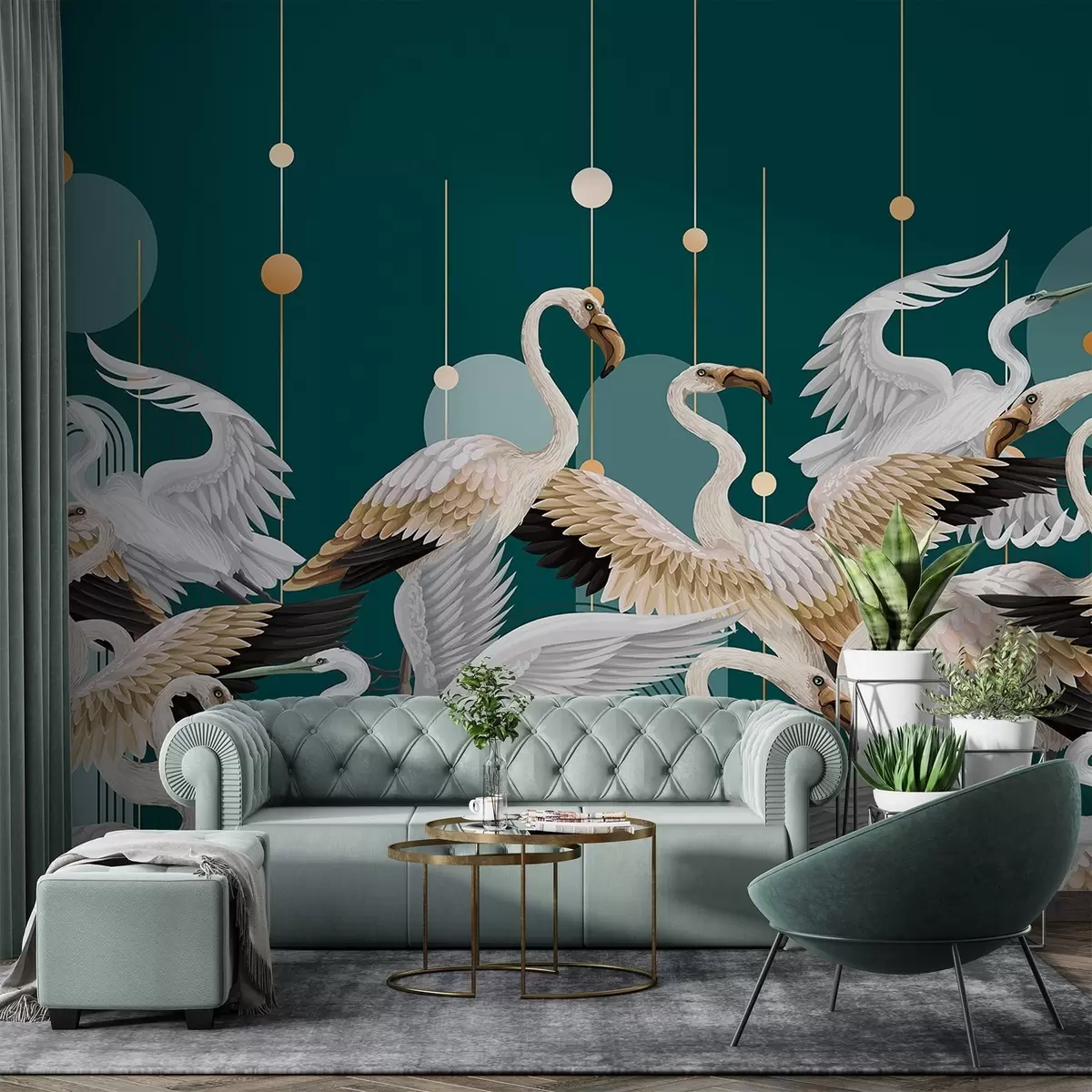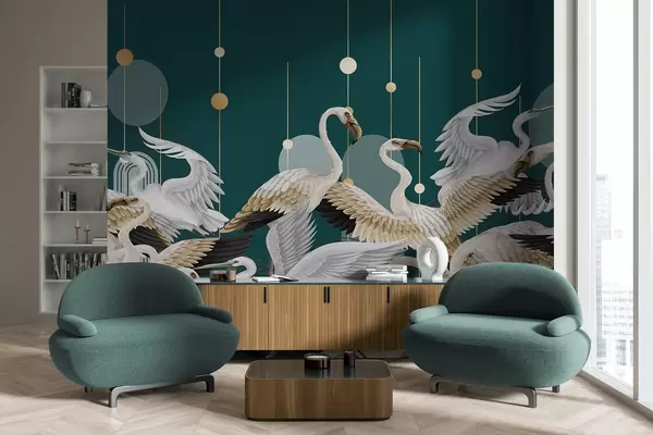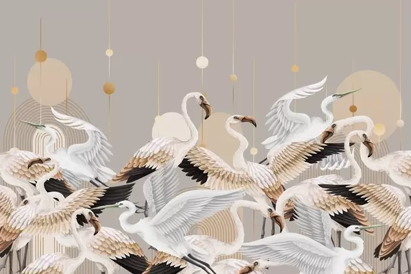 Valokuvatapetti Parvi valkoisia flamingoja, joilla on herkät siivet, tumman sinivihreää taustaa vasten, jossa on keltaisia viivoja ja ympyröitä. Nr w09546