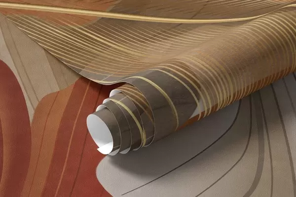 Valokuvatapetti Abstrakti teksturoitu, suurikokoinen, virtaava muoto, kermanvärinen ja ruosteenpunainen, herkillä keltaisilla, beigeillä ja ruskeilla höyhenillä. Nr w09549