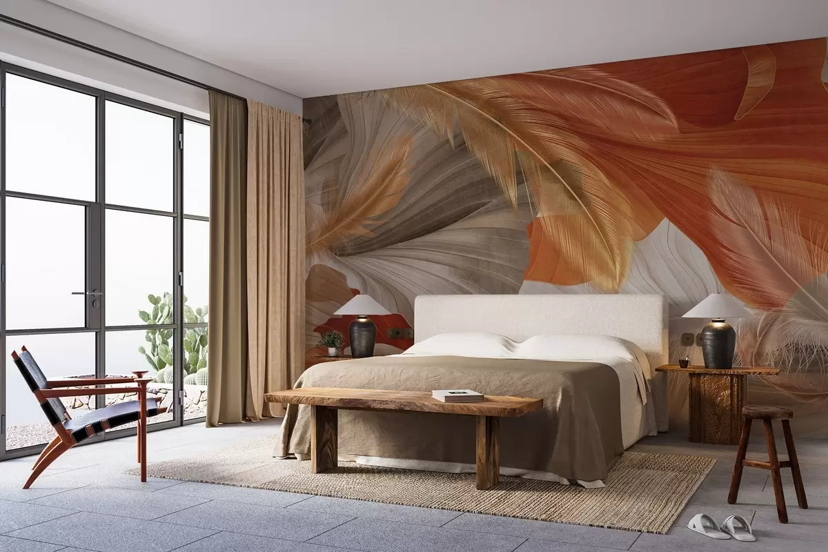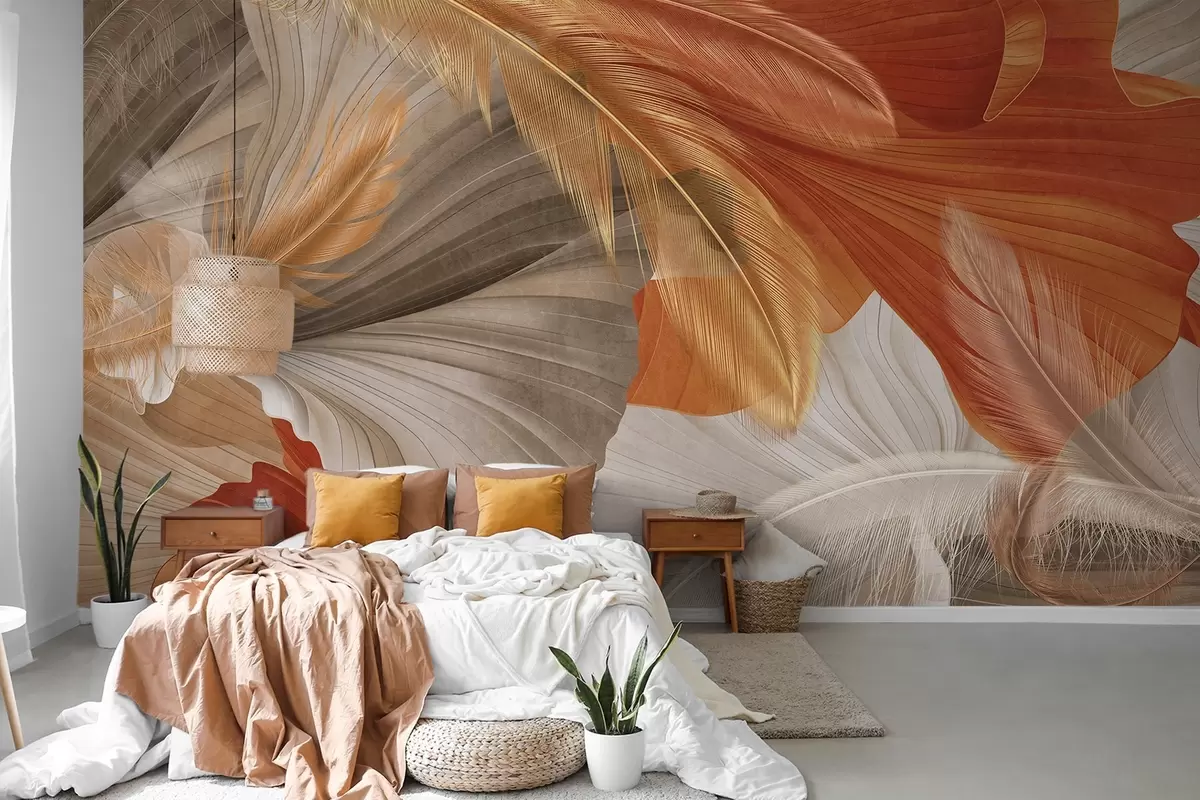 Valokuvatapetti Abstrakti teksturoitu, suurikokoinen, virtaava muoto, kermanvärinen ja ruosteenpunainen, herkillä keltaisilla, beigeillä ja ruskeilla höyhenillä. Nr w09549