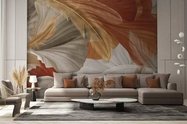 Valokuvatapetti Abstrakti teksturoitu, suurikokoinen, virtaava muoto, kermanvärinen ja ruosteenpunainen, herkillä keltaisilla, beigeillä ja ruskeilla höyhenillä. Nr w09549