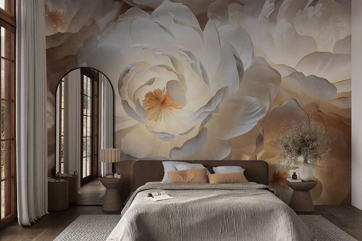 Valokuvatapetti Suuret, valkoiset fantasia-pionikukat, joissa on keltainen keskusta, pehmeä valaistus ja herkät, teksturoidut kerrokselliset terälehdet. Nr w09550