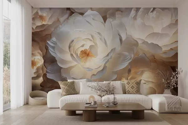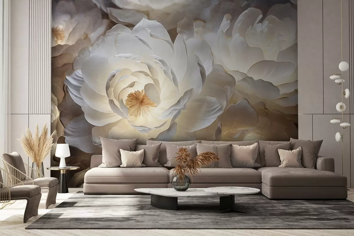 Valokuvatapetti Suuret, valkoiset fantasia-pionikukat, joissa on keltainen keskusta, pehmeä valaistus ja herkät, teksturoidut kerrokselliset terälehdet. Nr w09550