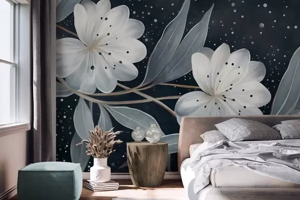 Valokuvatapetti Fantasiamaiset valkoiset kukat, joita ympäröivät sinivihreät lehdet ja oksat tummaa taustaa vasten Nr w09551