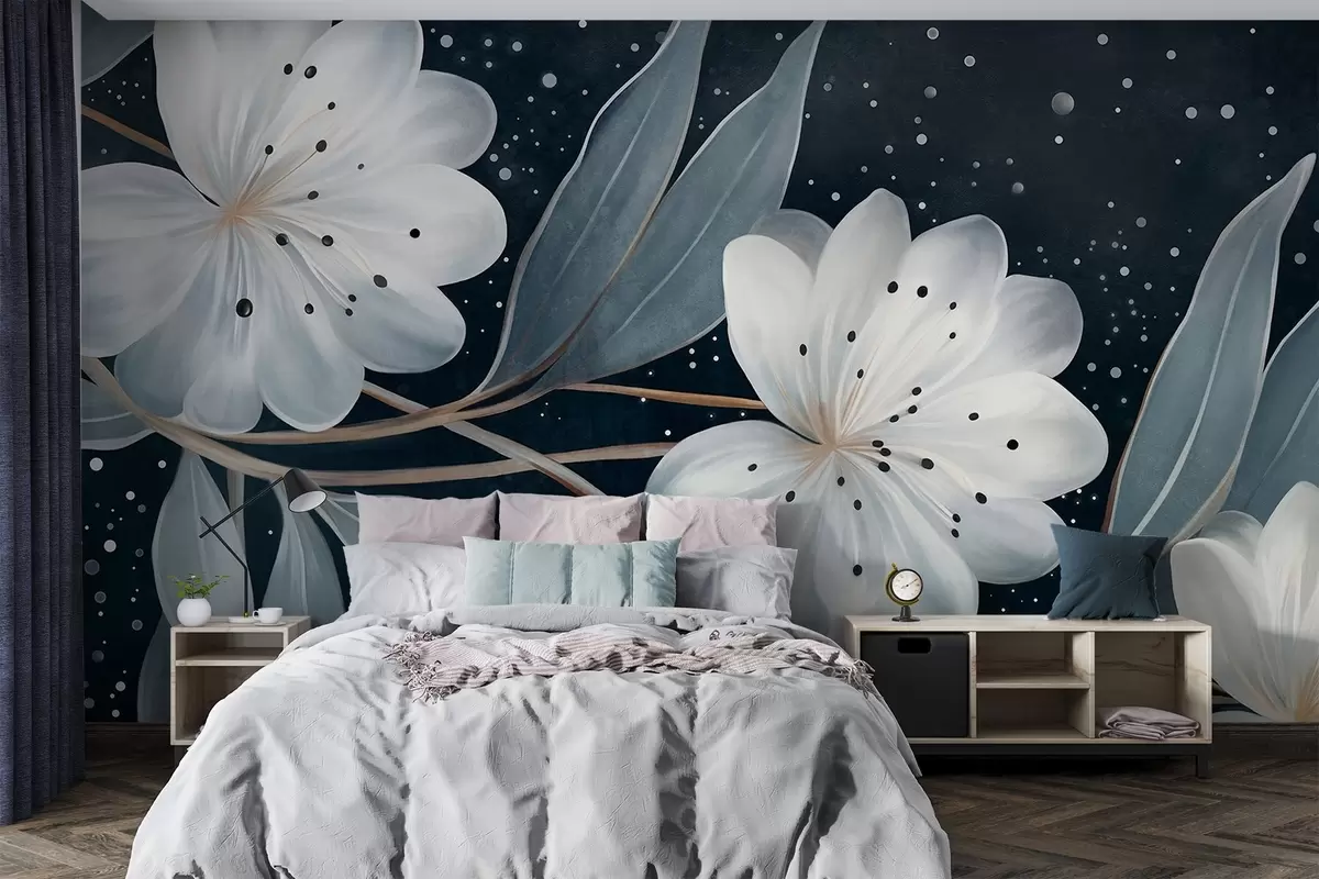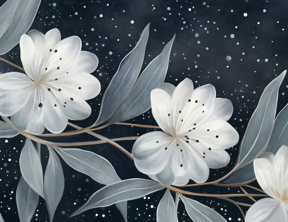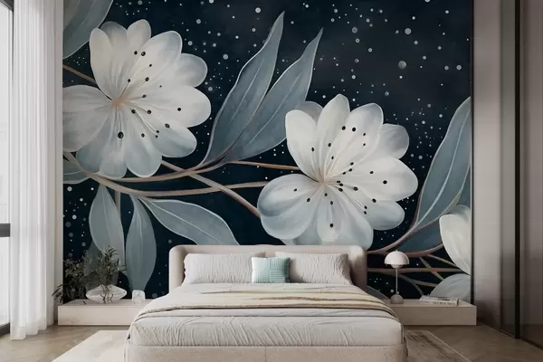 Valokuvatapetti Fantasiamaiset valkoiset kukat, joita ympäröivät sinivihreät lehdet ja oksat tummaa taustaa vasten Nr w09551