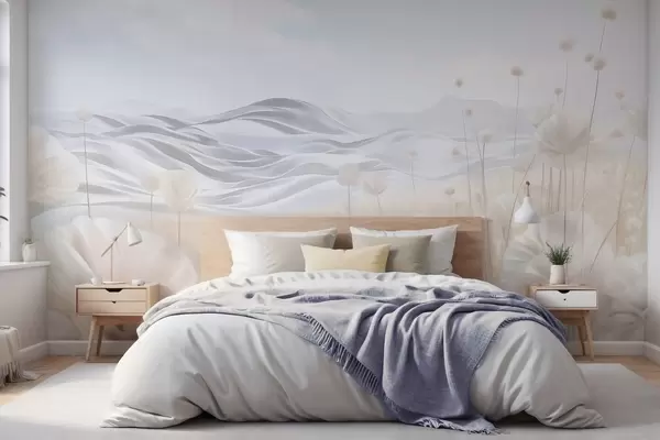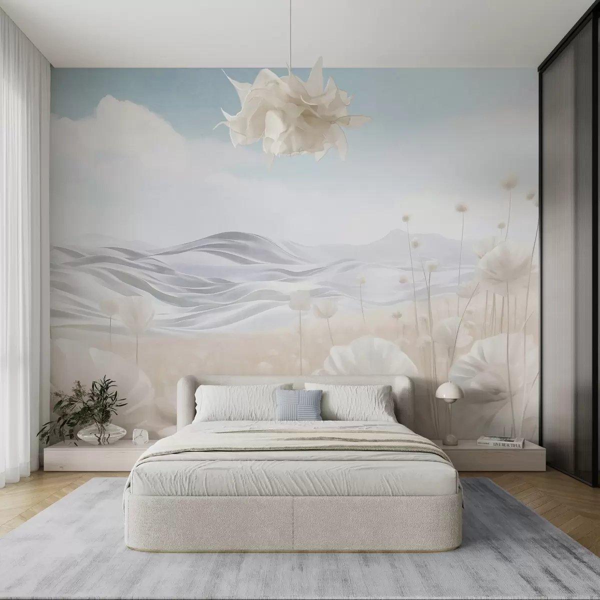 Valokuvatapetti Teksturoitu kenttä kermaisia unikoita ja kumpuilevia kukkuloita vaaleansinisen taivaan alla, jossa on pehmeitä pilviä, pastellivärejä Nr w09553